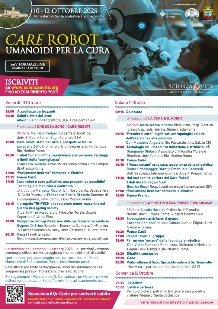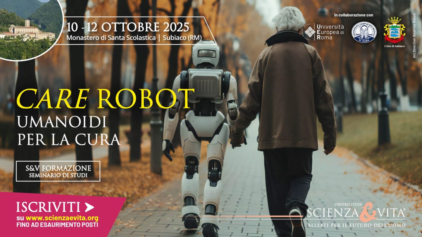 “Care robot: umanoidi per la cura” è il tema del seminario di studi in programma dal 10 al 12 ottobre a Subiaco, presso il monastero di Santa Scolastica. A promuoverlo il Centro studi Scienza & Vita (S&V) in partnership con due atenei romani: l’Università Europea e l’Università Campus Bio-Medico.