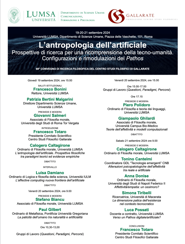 Dal 19 al 21 settembre 2024, dalle ore 15:00, si svolgerà presso l'Università LUMSA - Aula 5 - Piazza delle Vaschette n. 101, Roma - il 69° Convegno di Ricerca filosofica del Centro Studi Filosofici di Gallarate, dal titolo: L'antropologia dell'artificiale. Nella locandina e nei link che seguono, tutte le informazioni. LUMSA - Fondazione Centro... Continua a leggere →